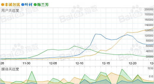 而對于其他幾部影片,“葉問”的搜索量排在第二,最高的時候逼近10萬,但已經呈現下滑趨勢,好在網友對它的評價極好,幾乎一致的贊不絕口,這將幫助拉動其后期票房;“赤壁”將于1月8日上映,目前其搜索次數還很少,大致在1萬多徘徊,百度的數據預測它可能達不到《赤壁上》3億多的票房記錄;“梅蘭芳”上映時間最早,網民的搜索次數已經持續走低,預計其票房將排名第四;至于“女人不壞”,目前網民的日搜索量僅1萬多,盡管網友的口碑極好,但預期也較低。