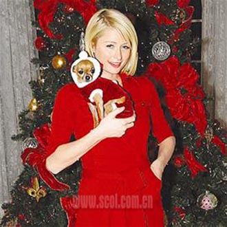 帕里斯·希爾頓與自己的寵物狗穿著圣誕衣,在一棵圣誕樹前拍照,這張照片將會被制成今年的希爾頓家族圣誕卡。