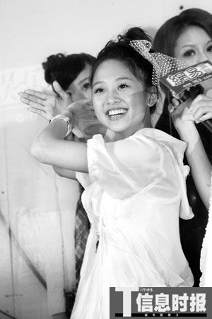 裝可愛是這群小女生的拿手本領(lǐng),應(yīng)主持人要求后,MeiMei率先在臉頰邊擺出OK的手勢,再配合微嘟的嘴,十分可愛。走氣質(zhì)美女路線的Apple則使出“一陽指”功夫,緊貼嘴唇做出“噓”的動作。大牙左右手并上,動作幅度大,謀殺了不少菲林。搞怪的鬼鬼擺出像龜波氣功的姿勢還笑說:“這是翻蓋手機(jī)。”而大方的她被問起人氣高是否因?yàn)楹秃谌恕巴印?其實(shí)只是房東跟房客的關(guān)系)時,就立刻流露出羞澀的神態(tài)一個勁揮手:“哎呀,不要這么說,他是好哥哥,很照顧我而已。”