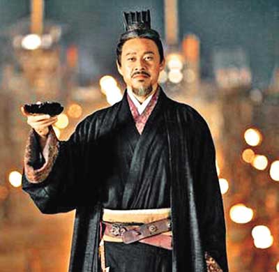 諸葛亮要說服吳國出兵便得說服周瑜,兩人見過面后安排在一禮賓房相會,彼此試探對方斤。周瑜邀諸葛亮合奏,諸葛亮利用琴音誘發周瑜的斗心,被激起情緒的周瑜越奏越快,此時鏡頭又捕捉正在沏茶的小喬,一剛一柔,令人印象深刻。