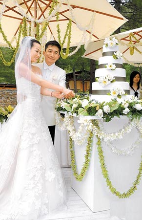 梁朝偉昨輕摟劉嘉玲的腰,共同切下5層結(jié)婚蛋糕。
