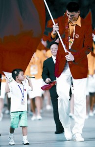 運動員入場,頭上有個疤痕的小男孩牽著姚明的手步入,開心地揮手。他是林浩,他的父親林大坤在接受晨報記者采訪時透露,開幕式結束后,林浩用“很自卑”形容自己和姚明走在一起的感受,原話是:“我很自卑。他是全場最高的人,我是全場最矮的人!