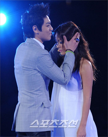 據體育朝鮮報道,15日晚7時,在首爾蠶室室內體育館舉行的“2008 Mnet-KM音樂節”( 以下簡稱“MKMF”)上,李孝利和T.O.P在共同演繹《謊言》時,表演了兩個嘴唇互碰的熱吻場面。
