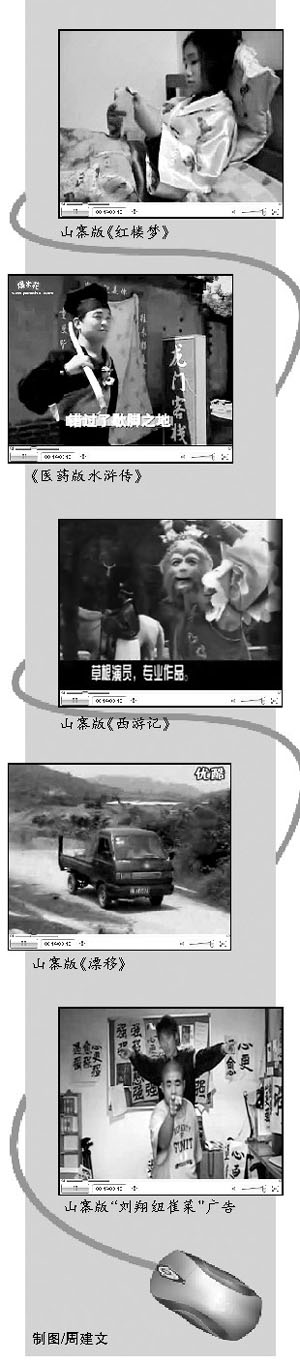 這只是近期眾多走紅網絡的網友自制影視劇中的一部。在電腦中輸入“山寨”一詞就會發現,電視劇《水滸傳》、《西游記》,電影《大話西游》、《尋槍》、《頭文字D》,“優樂美奶茶”、“劉翔紐崔萊”以及部分電視購物廣告,均被推出了山寨版。