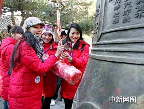 最后,模特與“潭柘寺2008國際職業(yè)模特大賽中國總決賽”組委會人員、門頭溝區(qū)領導,在寺內(nèi)撞響古鐘。