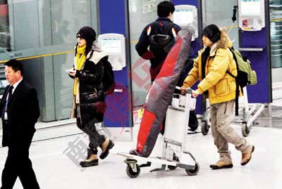 兩人情侶打扮,還帶著裝滑雪板的長袋子,裝備專業(yè)。看來,喜歡北海道的不僅僅是梁朝偉和劉嘉玲。