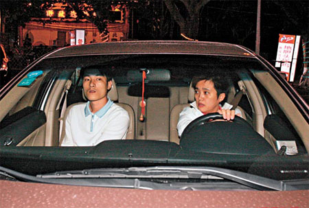 張母(右)及一名疑似張茆弟弟的男子,昨日由張家的海口寓所駕車出外。