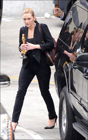 凱特·溫絲萊特對于自己的奧斯卡影后的稱號也是相當激動,下面小編給大家帶來一組圖片,大家可以看到,影后拿著小金人一直不肯撒手,生怕碰壞,可以看得出她是多么重視這個獎項了吧。順便說一下影后的穿著,一身黑色職業性濃厚,干練的盤發透出影后的氣勢。