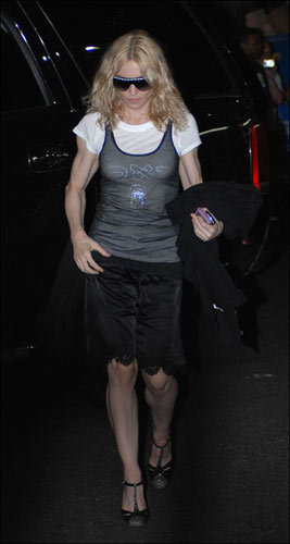 麥當娜每次出現都一定成為我們目光追逐點,因為發生在麥姐身上的人和物永遠都是那么標新立異。不是和22歲的年輕男模戀愛,就是穿了雷人的超級學生妹套裝,這次又是什么呢,這次是很普通的鏤空黑色網眼外衣里面搭配了白色短袖,下身則是穿了到膝蓋的短褲,高跟鞋,很普通的裝扮,但是麥姐就是能穿出不同,這次的不同就是那身無比發達可以媲美是史泰龍的肌肉了,看看那小腿,胳膊上的肌肉,小編突然想起了機械戰警……