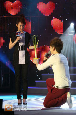 這位當(dāng)紅的人氣偶像不僅迷倒了在場(chǎng)的觀眾,連“海豚王子”王櫟鑫都拜倒在林依晨的裙下,現(xiàn)場(chǎng)更是搞笑上演抱蔥求婚一幕。林依晨獻(xiàn)唱了《你》后,在特別環(huán)節(jié)中接受了演技大考驗(yàn),主持人即興要求林依晨表演“求婚”的橋段。這時(shí),一旁的王櫟鑫按耐不住,自告奮勇上臺(tái)“求婚”。調(diào)皮的王櫟鑫手捧一顆大蔥,單腿跪下對(duì)林依晨深情告白:“親愛(ài)的晨晨,我知道你喜歡直樹(shù),所以我送你一顆蔥。雖然我沒(méi)有你家直樹(shù)帥,但我會(huì)每天為你唱情,對(duì)你好,嫁給我好嗎?”惹得現(xiàn)場(chǎng)觀眾大笑不已,一邊的男主持人大左更是醋意大發(fā),直言喜歡林依晨很久,也要向她求婚,不過(guò)大左的求婚禮物是非常具有長(zhǎng)沙特色的臭豆腐。面對(duì)一大盤(pán)黑乎乎的臭豆腐,林依晨似乎被其獨(dú)特的氣味嚇到,捂著鼻子直呼“我還是選擇蔥吧!”場(chǎng)面十分搞笑,晚會(huì)氣氛也達(dá)到了高潮。