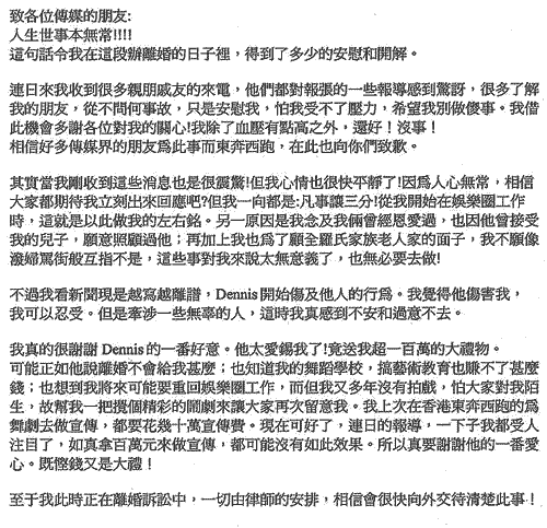 昨日李賽鳳首次對事件作響應,向傳媒發(fā)出聲明,她承認正在辦理離婚訴訟,但并沒有就和干兒子宗天意的關系作任何解釋,她表示除了有點血壓高外,一切還好,又說開始時對事件很震驚,但心情很快平復,并會堅持“凡事讓三分”的原則,因為她曾和羅啟仁相愛過,加上為顧全羅家的面子,她不愿潑婦罵街,不過覺得羅的行為傷及了他人(指宗天意),令她覺得很不安。李賽鳳還暗損羅啟仁,指連日來的報道等如給她送上百萬的宣傳費,為她將來重回娛樂圈鋪路,搞了個鬧劇替她宣傳,實在是太愛惜她了。