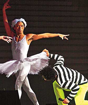 男舞蹈員反串穿芭蕾舞裙出場,Eason故意偷看他裙底搞笑。