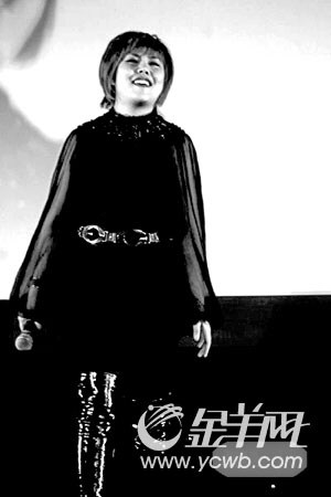 上圖:一身黑衣的紀(jì)敏佳現(xiàn)場(chǎng)演唱了奧運(yùn)歌曲《勝利》。