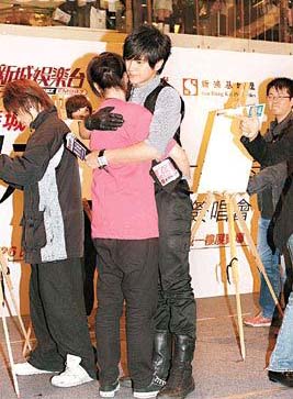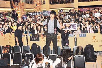 中新網12月27日電 羅志祥(小豬)昨午由臺灣抵港,出席下午在將軍澳新都城商場舉行的簽唱會,約三十名“粉絲”接機,雖然步出機場時面露疲態,但出席簽唱會時,小豬馬上又充足電,且十分親民,跟Fans抱抱之余,大合照時還舉起Fans自制的牌合照,還輕觸Fans玉手,逗得全場瘋狂大叫。簽唱會吸引近千人圍觀,場面熱鬧!