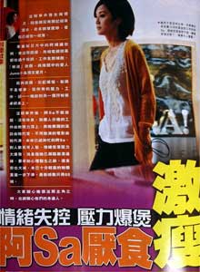 據(jù)《聯(lián)合晚報(bào)》報(bào)道,最新一期《3周刊》以“情緒失控 壓力爆煲 阿Sa厭食激瘦”為題,指阿嬌休假與愛人麥浚龍預(yù)支蜜月,剩下阿Sa一人扛起全部壓力和工作,使其情緒低落壓力大爆發(fā),剩下88磅體重,健康告急。