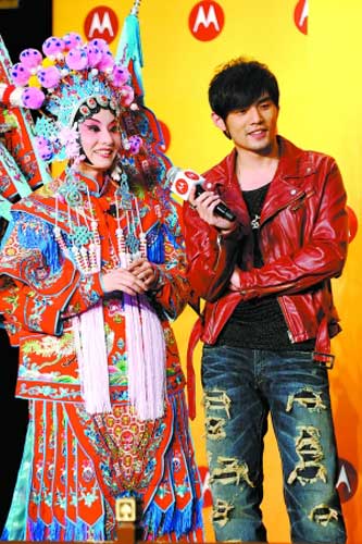 由周杰倫代言的摩托羅拉推出新款手機,不僅請到周杰倫,而且還邀請了京劇演員、變臉演員等進行表演。其中一名扮演“穆桂英”的女演員表示自己是周杰倫的“粉絲”,而周杰倫也饒有興趣的向這位京劇演員學唱“穆桂英掛帥”當中的經典選段,還表示想借“穆桂英”的行頭來穿穿。最后,周杰倫和“穆桂英”不僅共同演唱了改了詞的京劇,還一起用京劇的唱法合唱了周杰倫的名曲《千里之外》。對京劇流露出濃厚興趣的周杰倫聲稱:“我考慮在我的演唱會中加入京劇的元素。要是上萬人一起合唱京劇,實在是很酷!