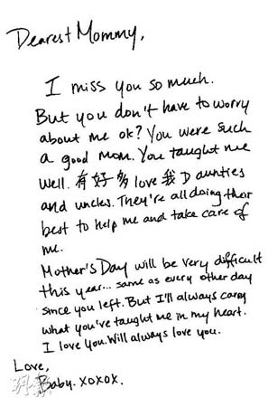 無(wú)法要求肥姐再做“母親節(jié)”專訪,所以《明報(bào)》轉(zhuǎn)托欣宜把肥姐的愛(ài)延續(xù)下去,記者寫到,當(dāng)欣宜靜靜地在寫給媽咪的信時(shí),我看她的眼淚一直在流,心里真的好痛,就因一個(gè)病,把一對(duì)相依為命的母女永遠(yuǎn)分開(kāi)了,欣宜就要一個(gè)人地走下去,看到她這封信寫著“親愛(ài)的媽咪,我好掛念你,但你不用掛心我,你是一位好母親,教導(dǎo)我好好成長(zhǎng),有好多愛(ài)我的姨姨與叔叔,他們都盡心盡力照顧我。今年的母親節(jié)對(duì)我來(lái)說(shuō)非常之不同,就如你已離開(kāi)我的每一天一樣,不過(guò)我永遠(yuǎn)都記得你教我的一切,你永遠(yuǎn)都在我心里面。我愛(ài)你!一直一直的愛(ài)你!Baby(肥姐對(duì)欣宜的昵稱)”