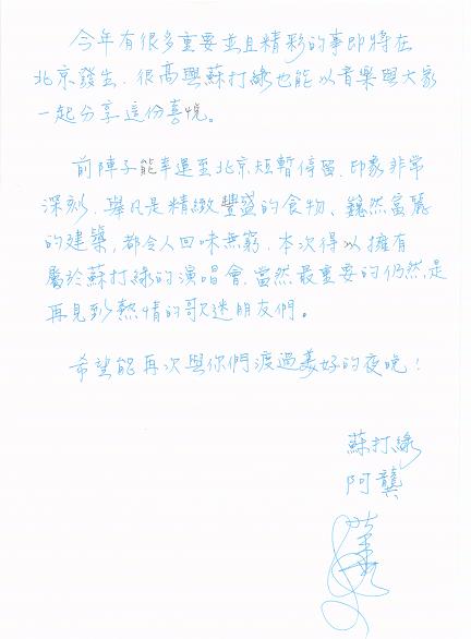 蘇打綠樂團的主唱吳青峰在手寫信中這些寫道:“有時生活像一趟不能回頭的旅行,有時候在旅行中生活。音樂和演唱是我的生活,也是讓我用思想旅行的隱形交通,每一次都有絕無僅有的色彩喝精彩。愿我們能共享北京那一次美好!睒穲F的鍵盤兼小提琴手的阿龔說到,“今年有很多重要并且精彩的事即將在北京發(fā)生,很高興蘇打綠也能以音樂與大家一起分享這份喜悅!