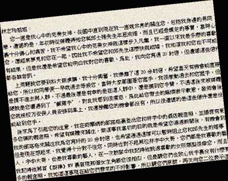綜合臺(tái)灣媒體消息,日前林志玲與林宇中在酒店“親吻照”在網(wǎng)絡(luò)瘋傳,該爆料者還欲以300萬(wàn)臺(tái)幣高價(jià)拍賣兩人更多的親密照,將這段似是而非的戀情推向最高潮。就在事態(tài)變得撲朔迷離之際,該名爆料者于24日在臺(tái)灣人氣論壇發(fā)表了《致林志玲姐姐的道歉信》,就自己的所作所為向林志玲和林宇中表示道歉,這封道歉信還向人們解開了林志玲酒店“親吻照”和遭遇“咸豬手”事件背后的諸多疑問。