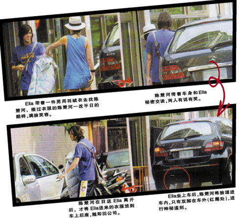 因《命中注定我愛你》走紅的陳楚河,疑似傳出新戀情,對象是一向中性風打扮的S.H.E成員Ella。臺灣某周刊最新一期拍到Ella身著藍色洋裝短裙,內搭比基尼內衣,以一身難得的女人味裝扮替緋聞男友陳楚河送外套。該周刊還稱,早前Ella真情告白刻骨銘心秘戀的圈內人,其實不是吳尊而是陳楚河。