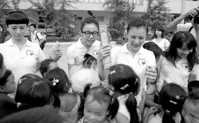 昨日,在綿陽(yáng)和靠近北川的永安鎮(zhèn),陽(yáng)光直射下的地面溫度超過(guò)40度。就在這樣的大暑天里,演員翁虹、孫莉、劉孜和歌手陳明等藝人帶著價(jià)值數(shù)萬(wàn)元的生活用品和毛絨玩具,先后造訪了綿陽(yáng)梓潼的兒童福利院和永安小學(xué)的孩子們,給他們帶去又一份來(lái)自遠(yuǎn)方的祝福和關(guān)愛(ài)。
