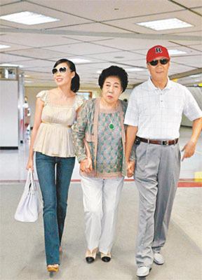 中新網8月7日電 2008年北京奧運會明晚即將開幕,新婚11天的臺灣鴻海集團董事長郭臺銘攜愛妻曾馨瑩、以及母親搭私人飛機抵京看奧運。他們一家三口洋溢天倫樂,被婆婆疼惜有加的曾馨瑩一路燦笑,看不出外界指她因壓力大而落淚的神情。同機隨行的還有他們的友人張清芳及夫婿宋學仁、臺積電董事長夫人張淑芬等。