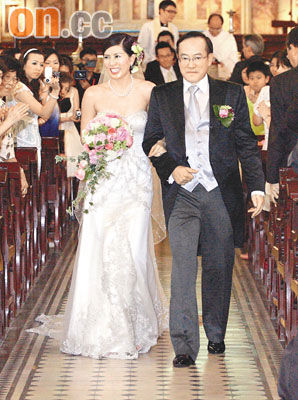 據(jù)了解,劉志敏昨晨接新娘時,除了闊綽地給五位數(shù)字開門紅包外,還與眾同樂,找出姐妹團預(yù)先收藏的“心心相印”兩顆心形貼紙,又以打油詩道出愛的宣言。雖然劉志敏身家豐厚,但對新娘相當(dāng)細(xì)心。當(dāng)兩人乘坐價值逾630萬元港幣的勞斯萊斯PHANTOM轎車抵達(dá)座堂時,他極有風(fēng)度地主動為羅慧娟開車門,更為有聽力障礙的她安排貼身保鏢侍候在側(cè),體貼無微不至。而羅慧娟身穿象牙白色低胸婚紗,配上珍珠及鉆石的頸鏈戒指,分外明艷照人。