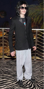 邁克爾·杰克遜近年飽受不利消息困擾,被指周身債之余,唱片銷(xiāo)量也大縮水,不過(guò)并沒(méi)有影響他慶祝50大壽的心情。上周四他現(xiàn)身賭城Planet Hollywood餐廳,與11歲兒子Prince Michael、10歲女兒Paris及6歲幼子Blanket一起吃晚飯,當(dāng)日邁克爾心情甚佳,對(duì)記者面露笑容,他坐著輪椅,全身用大披風(fēng)緊包,看來(lái)十分虛弱,而他拍照時(shí)西裝外套下露出的睡褲,格外引人注意。