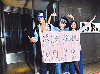 中新網(wǎng)9月4日電 蔡卓妍(阿Sa)抵臺(tái)兩天,記者目擊吳尊連續(xù)兩天當(dāng)“陪吃郎”,關(guān)系曖昧。前晚拍拖再被目擊,兩人索性把約會(huì)現(xiàn)場(chǎng)當(dāng)新片《武俠梁祝》(內(nèi)地名《劍蝶》)發(fā)表會(huì),同劇演出的庾澄慶(哈林)還拿著牌子猛插嘴,十分搞笑。