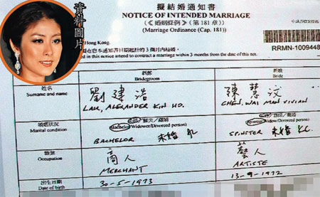 中新網(wǎng)9月17日電 香港媒體報道,陳慧琳(Kelly)和未婚夫劉建浩(Alex)拍拖16年,終于結(jié)束愛情長跑,兩人將于下月2日拉埋天窗,并于洲際酒店筵開55席宴請親朋。昨日在金鐘婚姻登記事務(wù)及紀(jì)錄辦事處,張貼了Kelly和Alex的擬結(jié)婚通知書,當(dāng)中寫上Kelly的真名“陳慧汶”及她身份證原用的英文名“Vivian”,而原來Alex的英文全名是“Alexander”,不過多年來外界已習(xí)慣簡稱他做“Alex”。通知書上也列出Kelly和Alex的出生日期,Kelly是72年9月,而Alex則是73年5月,Alex比Kelly差不多小一年。