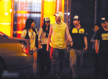 凌晨兩點左右,韓庚一群人先后走出了飯店,雖然已經夜深人靜,但韓庚卻還是小心翼翼,甚至把滑雪衫的帽子也罩在了頭上,造型看上去有點滑稽。第一次盯拍韓庚,記者覺得他在外出時比王菲那些大腕顯得還要謹慎小心,真應了那句俗話——“人怕出名豬怕壯”。