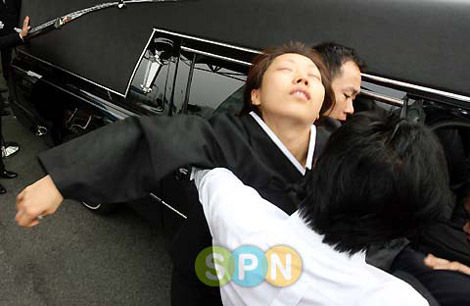 演員安在煥的出殯儀式于11日早晨8時在首爾江南圣母醫院殯儀館舉行,妻子鄭善姬再次暈倒,令現場人員難過萬分。(圖片來源:Edaily SPN)