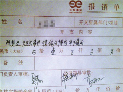 這份報銷單中,開支內容一欄寫的是“陳楚生失蹤事件媒體及博客寫手費用”,部門負責人審核一欄簽有天娛傳媒宣傳總監吳夢知的名字,公司領導審批則有天娛總經理龍丹妮和天娛副總楊柳的簽名。