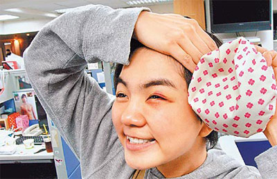 她左眼立刻腫起及嚴重瘀青,她回家后不斷冰敷,還慶幸:“只差一點,就打到眼球,好險!”樂觀的她昨進所屬華研音樂辦公室,還大喊:“快來看團團圓圓,來我這里看貓熊免排隊喔!”不過她現在最擔心周五預定要拍廣告,目前左眼的瘀青沒把握來得及消褪,華研表示若屆時傷勢未痊愈,只好跟廠商協調延期拍攝。