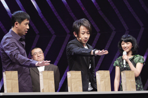 還是春晚那身打扮,劉謙不停給場下高呼他名字的粉絲放電,引發了一陣陣的尖叫聲。第一次上場,劉謙就用紙巾變成了一條彩帶,并讓彩帶從空中飛出去,把康洪雷導演接到了臺上。不過這只是略施小技,為了考驗康洪雷手下的膽量,劉謙用了五個紙盒,當著眾人的面在其中一個中藏了一個破碎的啤酒瓶,然后讓演員們用力去擊打。還好,經過劉謙的“施法”,最后并沒有一人受傷,不過倒把現場觀眾嚇出一身冷汗。最后,劉謙把兩個“團”字變成了一張《我的團長我的團》的海報,就完成自己的這次走穴任務。