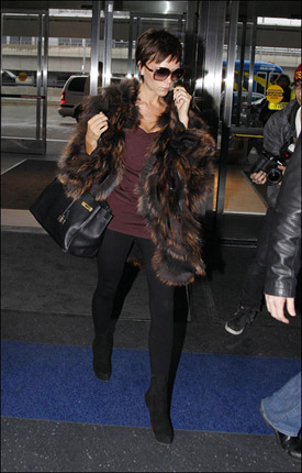 剛剛結束了阿瑪尼第五大道開業(yè)典禮活動的維多利亞·貝克漢姆又馬不停蹄的換回了雷人的裝扮,摘掉了藍色的發(fā)卡,換上了皮草大衣,這次的衣服毫無貴婦裝扮可言,遠遠看去就像是一只被火燒到毛的火雞,實在是雷人不淺,唯一值得一提的還是黑面上的那副墨鏡,還是蠻好看的。