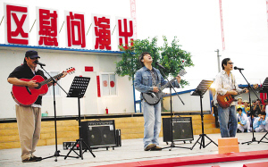 得知“心連心”前來演出,不大的擂鼓鎮廣場擠滿了 5000多名從四處趕來的北川人。上午9時,在導演兼主持人馬東的“吆喝”中,央視名嘴王小丫、張澤群、董浩、撒貝寧、韓喬生樂一一亮相,分別為災區人民送上一句祝福。而最難得的場面是平時說比唱多的央視名嘴齊秀唱功。不過最搞笑的當屬“韓大嘴”,他一發聲,調不知跑哪兒去了,頓時笑翻全場。接下來,鞠萍、趙保樂的《為了誰》,郭峰演唱的《勝利》,孫悅等人演唱的《好人好夢》和觀眾進行了臺上臺下的熱烈互動,把現場氣氛推向高潮。