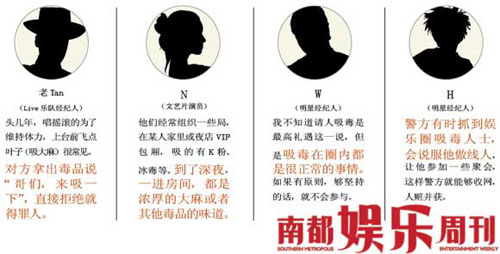 一個手底下帶著以曲藝形式包裝的Live樂隊的經紀人老Tan對本報記者透露,自己也曾遇到過這種情況,對方拿出毒品說“哥們,來吸一下”,這個時候,如果你不夠圓滑,直接拒絕就可能得罪對方。“如果我走進包房,聞到有什么異樣的味道,我就會待一會兒,趕緊走。如果真躲不過被對方問到,我也會找個理由,比如上廁所或者其他什么的,溜掉。肯定不能讓對方覺得我不把他當哥們。當然,這也是一時之計,時間長了,人家也知道你不好這口,干脆就不帶你玩兒了。” 也有某經紀人W說:“我不知道請人吸毒是最高禮遇這一說,但是吸毒在圈內都是很正常的事情。如果有原則,夠堅持的話,就不會參與。我看見有人吸,也會勸勸對方別沾這個。不過圈內最正常的玩法還是喝酒和泡妞。”