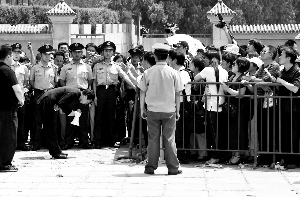 在安排群眾進(jìn)入追悼會現(xiàn)場時,由于悼念群眾人數(shù)眾多,現(xiàn)場秩序一度混亂。一直代表央視維持秩序的郎永淳再次站出來,代表家屬向未能進(jìn)場的群眾表示道歉,并兩次鞠躬。看到如此誠意,群眾才開始慢慢退場。據(jù)現(xiàn)場工作人員介紹,共有9000左右的人進(jìn)入到靈堂悼念,而來到現(xiàn)場的人則有上萬。