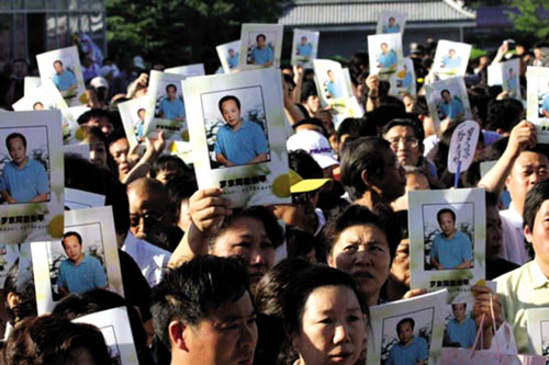 在哀樂聲中,不少群眾流下了眼淚,有的女性觀眾當(dāng)場(chǎng)嗚咽著說:“羅京一路走好!一路走好!”聲音極度悲戚。羅京的哥哥手捧遺像送了弟弟最后一程。整個(gè)過程中,羅京的哥哥一語未發(fā),雙目無神,表情悲痛,由于過于傷悲,這位中年人竟已捧不住手中那并不十分沉重的遺像,而是由倆位親友一直在一左一右用力攙扶才能前行。