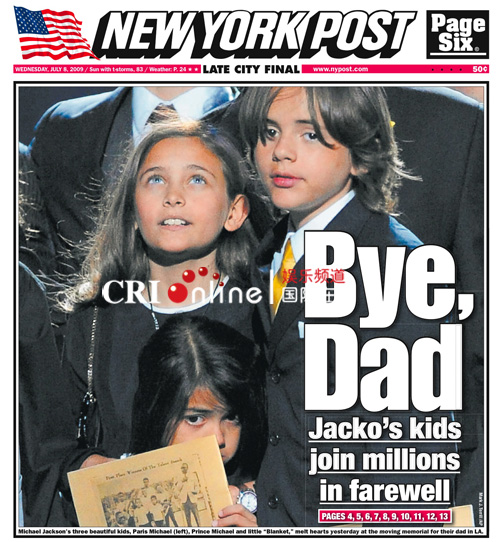 2009年7月9日訊,洛杉磯,當(dāng)?shù)貢r(shí)間7月7日,流行音樂之王邁克爾·杰克遜(Michael Jackson)的公眾悼念儀式在美國洛杉磯的斯臺(tái)普斯體育中心舉行。當(dāng)?shù)貢r(shí)間7月8日,《紐約郵報(bào)》把杰克遜三遺孤的合影當(dāng)做封面,孩子們泛紅的眼圈,哀傷的神情令人心酸。