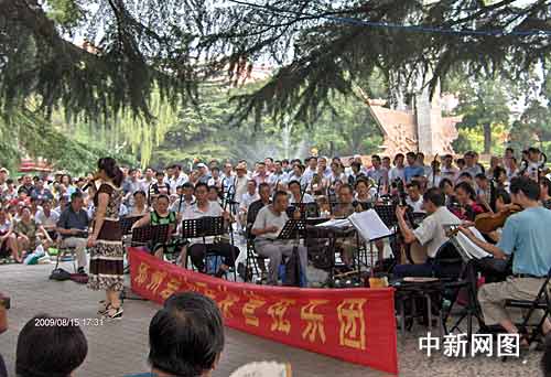 鄭州市碧沙崗公園,是為紀(jì)念北伐戰(zhàn)爭的烈士而修建的,而今成為人們休閑的主要場所。在這里,有一個民間組織——“鄭州碧沙民族管弦樂團(tuán)”,不僅頗具規(guī)模,而且水平也很專業(yè),演職人員全是來自民間。“兩株巨松當(dāng)戲棚,樹下平地做舞臺”,圍觀的人們既是觀眾又是演員。