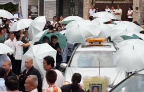 報(bào)道指出,今日(周六,8月22日)早上約10時(shí)15分,朱父正式封棺儀式并準(zhǔn)備抬上靈車(chē),從朱宅傳出不少號(hào)哭聲。直至11時(shí)30分,朱父靈柩在殯儀隊(duì)奏樂(lè)開(kāi)路下,從朱家緩緩駛出。走在前頭的是朱家幼女朱麗華的夫婿顏華潤(rùn),他在多名親友的雨傘下,企圖以“聲東擊西”的情況引開(kāi)攝影鏡頭,借此混淆視聽(tīng),而大批媒體、攝影記者圍睹上去閃光燈閃不停,使殯儀隊(duì)伍行駛緩慢。