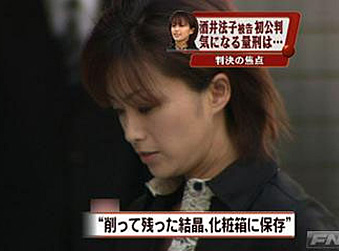 中新網10月26日電 被控違反《興奮劑取締法》持有、使用毒品的日本女星酒井法子(38歲,本名高相法子)首次公審26日在東京地方法院(審判長:村山浩昭)進行。酒井在法庭上對起訴內容供認不諱。檢方求刑1年零6個月,判決計劃將于11月9日下達。