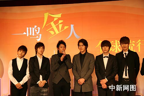 中新網(wǎng)11月16日電 (李季) 16日下午,來(lái)自馬來(lái)西亞的光良、韓國(guó)組合Super Junior—M、港臺(tái)藝人張韶涵、蕭亞軒、信和內(nèi)地明星張杰、江映蓉在北京出席“一鳴金人—全球流行音樂(lè)金榜新聞發(fā)布會(huì)”,眾星紛紛為此活動(dòng)獻(xiàn)上自己為精心準(zhǔn)備的各種“金色”賀禮。