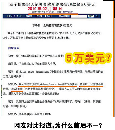 籌款之時(shí)見諸報(bào)端的善款數(shù)字,與網(wǎng)友各處追查而得的結(jié)果相差甚遠(yuǎn),有人認(rèn)定章子怡中飽私囊,打著慈善的名號(hào)謀利。章子怡究竟募集了多少善款?700萬(wàn)美元?200萬(wàn)美元?100萬(wàn)美元?50萬(wàn)美元?章子怡說(shuō),在戛納募捐現(xiàn)場(chǎng)籌集到的現(xiàn)金實(shí)際只有1392.36美元。