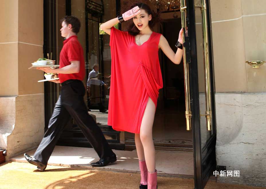 鞏新亮在法國巴黎雅典娜廣場酒店門前拍攝的時裝大片,一身紅衣,玲瓏曲線身材凹凸有致,令人著迷。