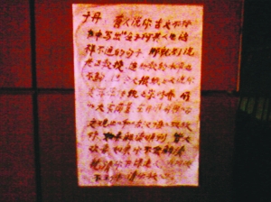昨天上午,記者突然從某網站上發現了一個有關于丹來寧做講座的帖子,打開帖子一看,記者不禁嚇了一跳。原來發帖人周二晚上路過鳳凰國際書城時,意外發現外墻上貼了一張匿名的小紙條。紙條上的留言挑釁意味明顯,甚至帶有一些恐嚇色彩。該發帖人于是用手機將紙條拍成照片,貼在了網上。