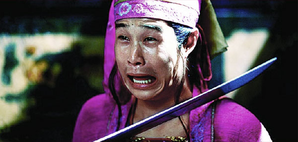 在影片中小沈陽出演的是一面館小伙計,雖然身量“弱不禁風”,但卻對武功特別癡迷,小沈陽說:“這是一挺陽光的小伙,平時好說好鬧,他爸爸是個殺豬的,挺有錢,他一門心思地練武功,自詡為‘武林中人’。”有趣的是小沈陽的造型,絕對稱得上是“嬌艷”,不是小紅襖里配個紅布兜,就是翠生生的綠長袍,再配上他那幾下花拳繡腿,不等說臺詞就能讓人樂噴了。看來張藝謀也充分發(fā)掘了小沈陽“男扮女裝”的表演特色,他在評點這個人物時自己更笑不攏嘴,“他造型簡直像新版‘西門慶’,服裝的效果讓他很‘水靈’,而他的表演最有特點的就是眼睛。”小沈陽自稱塑造了有史以來最經(jīng)典的“俠客”形象,他在片場常念叨的搞笑臺詞是:“我是令狐沖的弟弟——大蔥。”