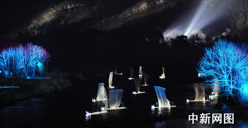 《印象·大紅袍》實景演出中的一幕:行舟山水。鋼東昆 攝